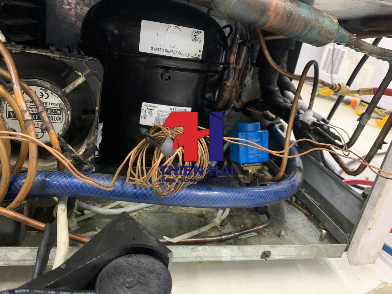 - Máy nén đã được nhân viên Kỹ Thuật Thiên Hải lắp vào hệ thống tủ đông Showcase: